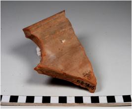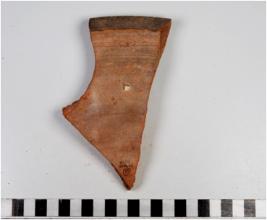 | Description / विवरण | A fragment of a dish on stand base of red ware with flaring profile, painted with black showing horizontal lines on exterior of medium fabric. |