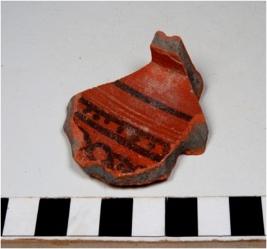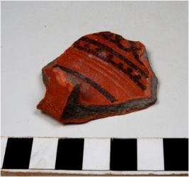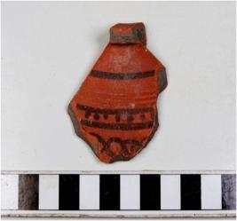 | Description / विवरण | A fragment of a pot of dark red ware with broken rim treated with red slip painted with black showing horizontal lines inbetween dots pattern on exterior of fine fabric fine texture. |