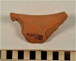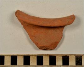 | Description / विवरण | Fragment of rim a vase of red ware with flanged rim, concave neck, oblique sides of medium fabric rough surface. |