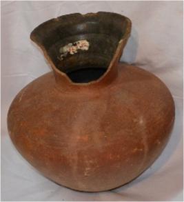 Water vessel with a high neck and averted rim. The pot is black from inside and red from outside. It is tapering towards the round base.