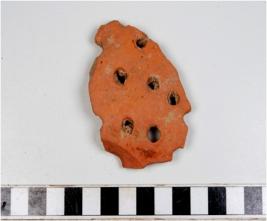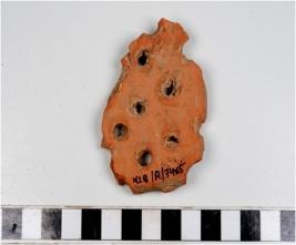 | Description / विवरण | A potsherd of red ware with perforated surface of medium fabric. |
