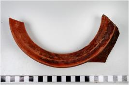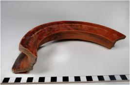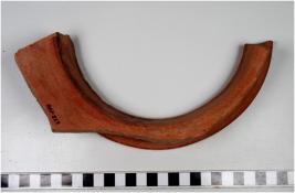 | Description / विवरण | A fragment of a jar of red ware with out turned rim, concave neck, oblique sides showing rows of incised horizontal lines spreading shoulder treated with red slip of medium fabric. |