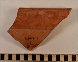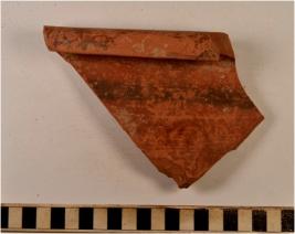 | Description / विवरण | A fragment of a jar of red ware treated with red slip, having externally thickened flanged rim, concave neck, oblique sides of thick fabric, sturdy texture, painted with horizontal band in black pigment on the exterior, well levigated smooth surface. |