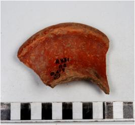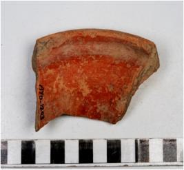 | Description / विवरण | A fragment of a vase of red ware with incurved thickened rim, concave neck and straight sides of medium fabric. |