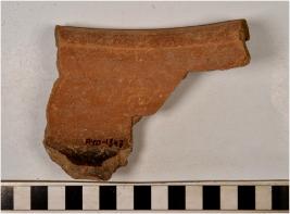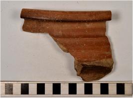 | Description / विवरण | A fragment of a handi of red ware with flanged rim, carination o waist of medium fabric with ribs on shoulder. |