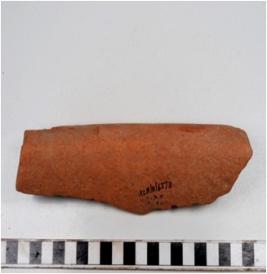 | Description / विवरण | A fragment of a jar of slipped red ware with flanged rim, concave neck, showing horizontal band on rim top of thick fabric. |