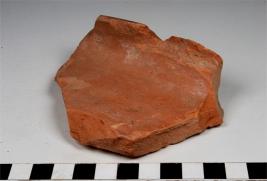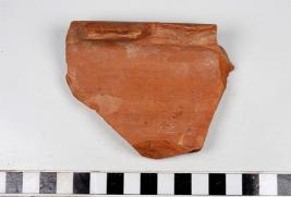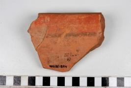 | Description / विवरण | A fragment of a wide mouthed jar of red ware with flanged rim, straight sides, painted with black showing horizontal bands on interior, treated with red slip of fine fabric. |
