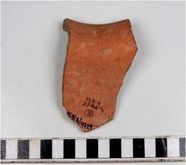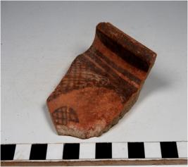 | Description / विवरण | A fragment of a vase of red ware having mica dust with flaring rim, concave neck, oblique sides painted horizontal band and arch filled with check design in black on the exterior of medium fabric. |