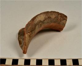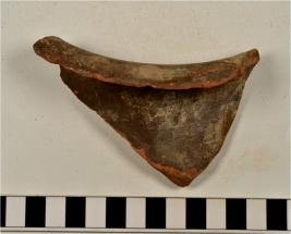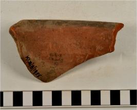 | Description / विवरण | A fragment of a vase of red ware with flanged rim, concave neck, oblique sides of fine fabric. |