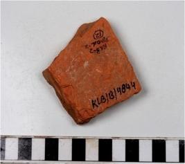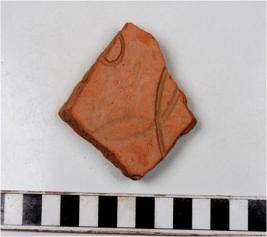 | Description / विवरण | A potsherd of red ware showing incised floral design on the surface of thick fabric. |