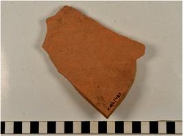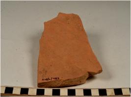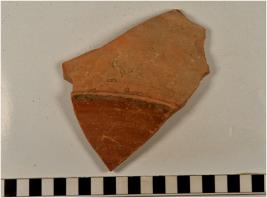 | Description / विवरण | A potsherd of a red ware painted with black showing horizontal band on ridge, treated with red slip of fine fabric. |