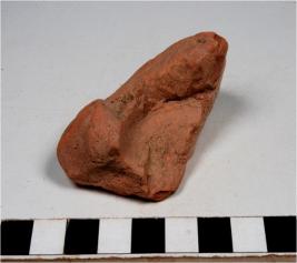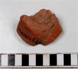 | Description / विवरण | A fragment of a base of red ware with broken base, showing incised semi circle design on the surface of thick fabric. |