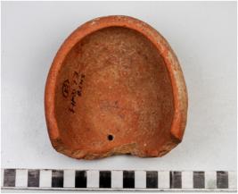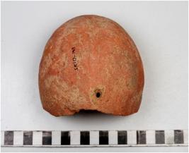 | Description / विवरण | A fragment of a bowl of red ware with incurved rim, broken from on side, spherical profile round base with perforation in botton of medium fabric. |