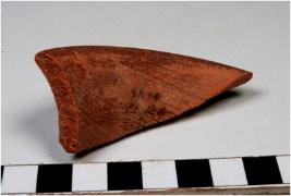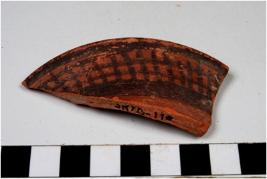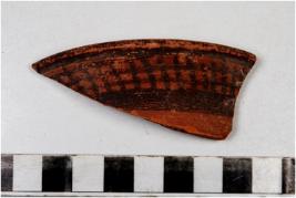 | Description / विवरण | A fragment of a vase of red ware with flared rim, oblique sides, painted with broad bands in between filled with check design in black on the exterior of medium fabric. |