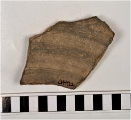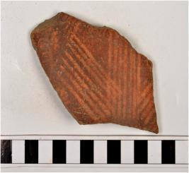 | Description / विवरण | A potsherd of russet coated painted ware, painted with white showing group of oblique lines, of fine fabric. |