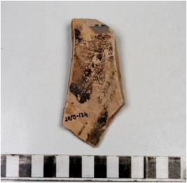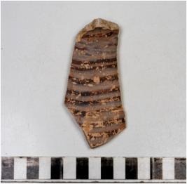 | Description / विवरण | A potsherd of buff ware painted with horizontal black lines on the exterior of medium fabric. |