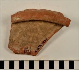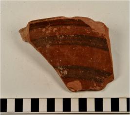 | Description / विवरण | A fragment of a lid of red ware with flaring profile circular information painted with black showing horizontal band on its exterior treated with red slip of fine fabric. |