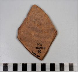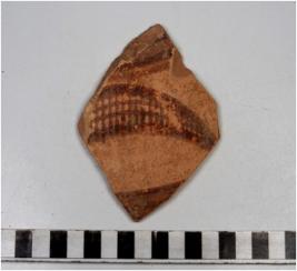 | Description / विवरण | A potsherd of buff ware painted with brownish red showing check pattern within horizontal lines on exterior of fine fabric. |