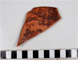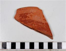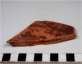 | Description / विवरण | A fragment of a rim of red ware with splayed out rim, painted with black showing vertical horizontal lines on interior, treated with red slip of fine fabric. |