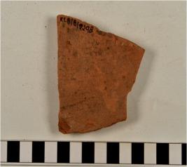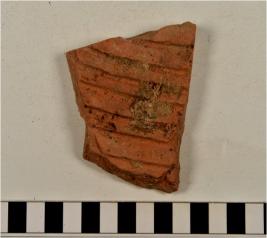 | Description / विवरण | A potsherd of red ware showing deep grooves on the interior of thick fabric. |