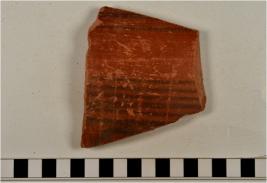 | Description / विवरण | A potsherd of slipped red ware painted with horizontal lines in black on the exterior of thick fabric fine texture well levigated. |