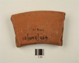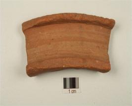 | Description / विवरण | Fragment of a vase of red ware, treated with red slip on both sides, partly broken rim, vertical neck and oblique notches on the rim. |