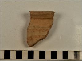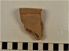 | Description / विवरण | A fragment of a basin of red ware with nail headed rim, oblique sides, having row of incised oblique strokes on surface of medium fabric and ill fired. |