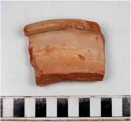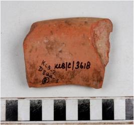 | Description / विवरण | A fragment of a vase of red ware with flanged rim, vertical neck, tapering sides of thick fabric, well levigated. |