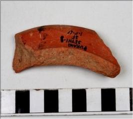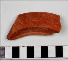 | Description / विवरण | A fragment of a rim of red ware with flanged rim, treated with red slip of fine fabric. |