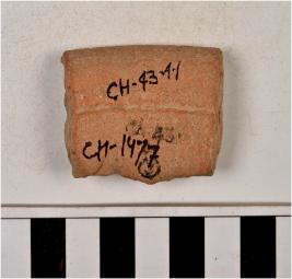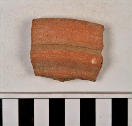 | Description / विवरण | A fragment of a rim of red ware with featureless rim having rib on neck. |