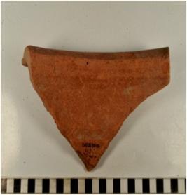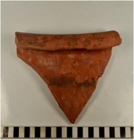 | Description / विवरण | A fragment of a jar of red ware with flanged rim, oblique sides, painted with black showing horizontal band on exterior, treated with red slip of fine fabric. |