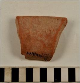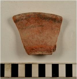 | Description / विवरण | A fragment of a rim of red ware with flanged rim, painted with black showing horizontal band on rim of fine fabric. |
