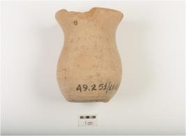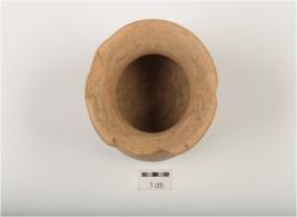 | Description / विवरण | A miniature vase of red ware, treated with red wash, outturned rim, partly chipped off, flat base and convex profile. |