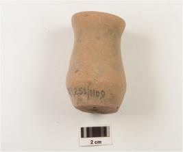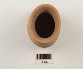 | Description / विवरण | A miniature vase of dull red ware has flaring rim, concave neck, bulging profile and floot base. |