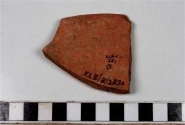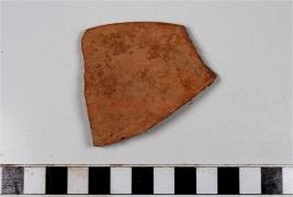 | Description / विवरण | A fragment of a bowl of red ware with featureless rim tapering sides of fine fabric. |