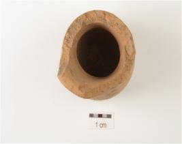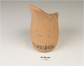| Description / विवरण | A fragment of a miniature beaker of a dull red ware, treated with red slip, flaring rim, cylindrical body with a flat base. |