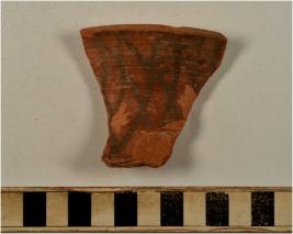 | Description / विवरण | A fragment of a vase of red ware with flared rim concave neck, treated with red slip having criss cross design in black on surface of fine fabric. |