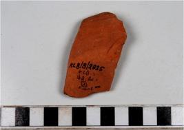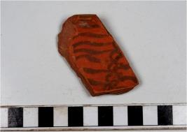 | Description / विवरण | A fragment of a rim of slipped red ware with out turned rim painted with black showing wavy design in between chain pattern on surface of fine fabric. |