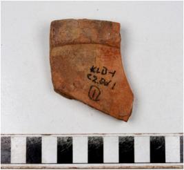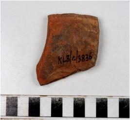 | Description / विवरण | A fragment of a dish of red ware with incurved rim and flat base of medium fabric rough surface, smoky surface. |
