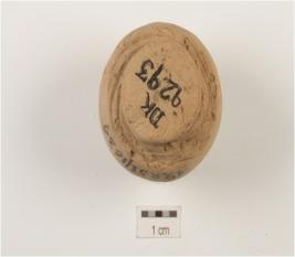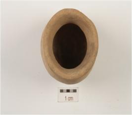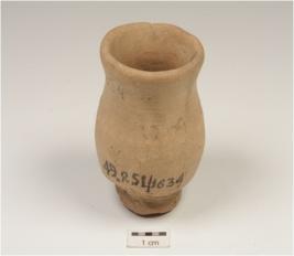 | Description / विवरण | A miniature vase of redware has featureless rim with flaring neck, concavity below, bulbous profile and foot base. |
