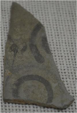 It is a fragment of PGW pottery with black painting on it. It is a fragment of the body part of pottery.