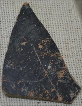It is a fragment of N.B.P.W. Pottery. it is a fragment of the body part of pottery. The black polished surface of potsherd is eroded.