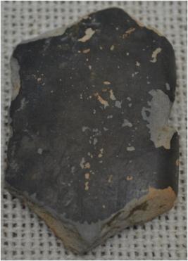It is a fragment of N.B.P.W. Pottery. it is a fragment of the body part of pottery. The black polished surface of potsherd is eroded.