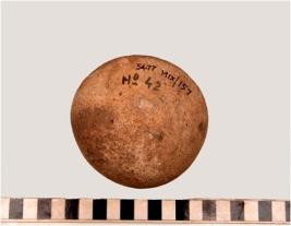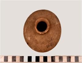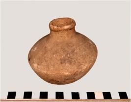 | Description / विवरण | A complete a pot of buff ware with narrow mouth, round headed rim, vertical neck, carination on waist, shallow base of medium fabric, coarse surface. |