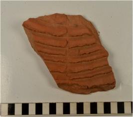 | Description / विवरण | A potsherd of a red ware showing grooves on interior of fine fabric. |