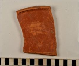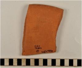 | Description / विवरण | A fragment of a base of dish on stand of red ware with flaring profile, painted with black showing horizontal band on exterior, treated with red slip of fine fabric. |