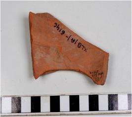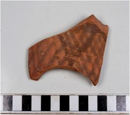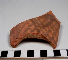 | Description / विवरण | A potsherd of red ware painted with black showing cirss cross design on the surface of medium fabric. |