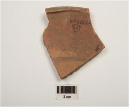 | Description / विवरण | A fragment of miniature dish of red ware treated with red slip on the both sides and painted with rim band and horizontal lines in black pigment has in curved externally thickened rim. |
