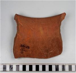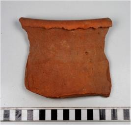 | Description / विवरण | A fragment of a storage jar of red ware with out turned rim, concave neck, spreading shoulder straight sides of thick fabric well levigated. |