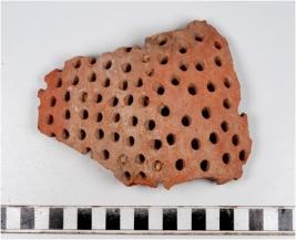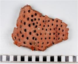 | Description / विवरण | A potsherd of a red ware having perforation of thick fabric, fine texture. |